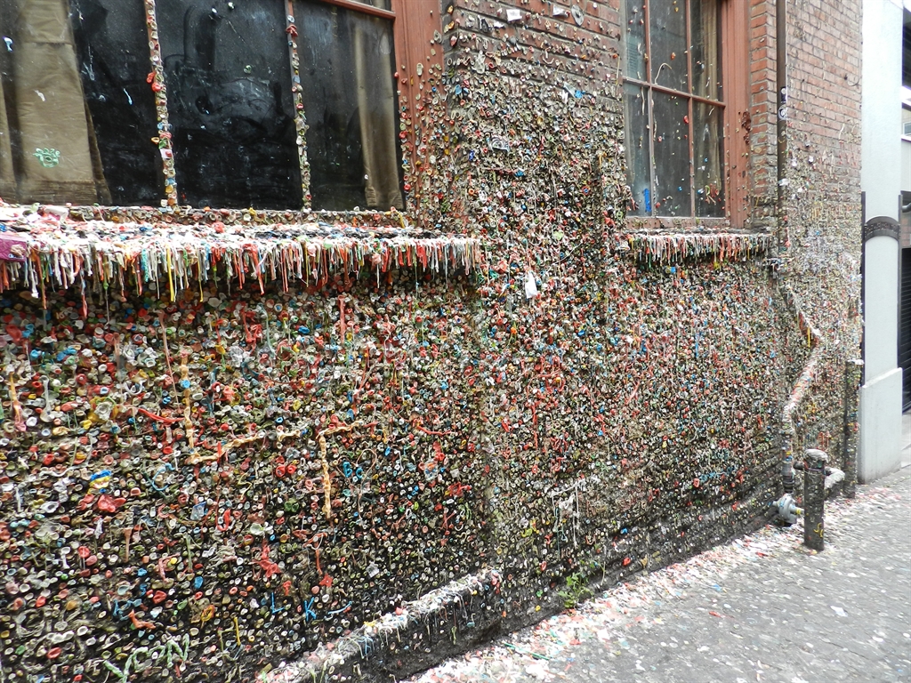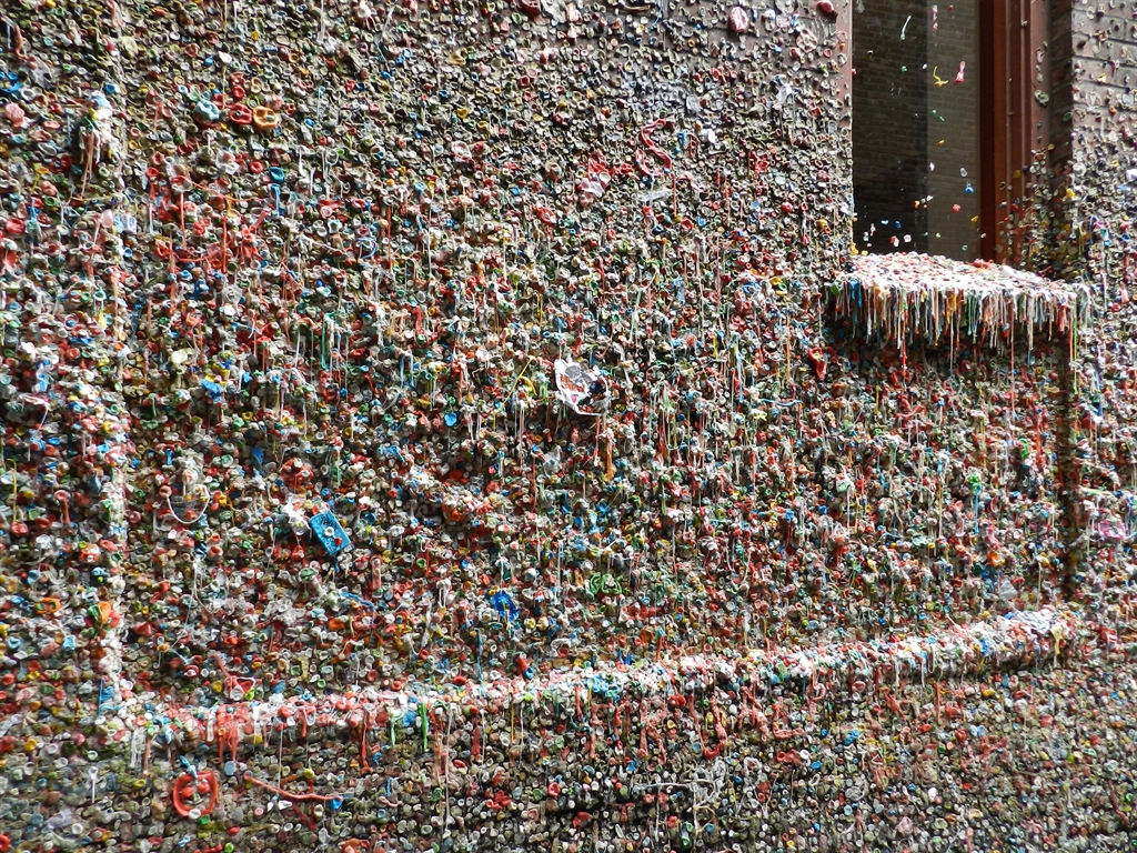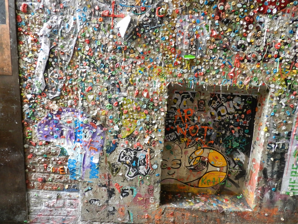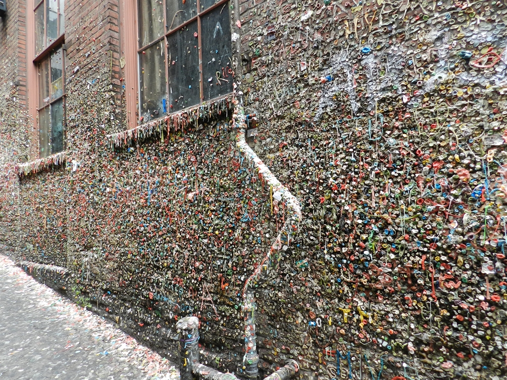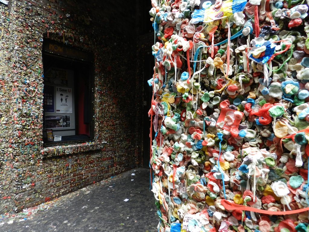 During a recent stay in Seattle, WA, we explored Post Alley. Located underneath the Pike Place Market, this area is famous for one of the most vile reasons; The Gum Wall. I had the area on my list of places to explore as not only is it a popular attraction, but somewhere on that disgusting wall of germ infested gum is a geocache. If you have eagle eyes you might even be able to spot it in the pictures.