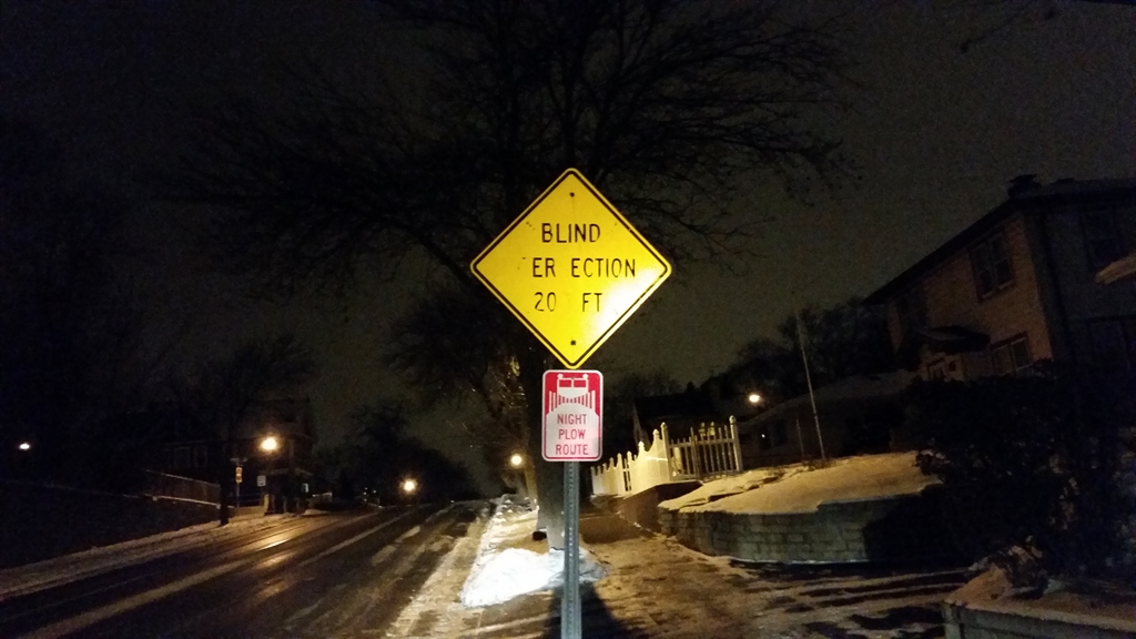 Be careful on the streets of St. Paul, MN, after dark. Found this warning on George Street East on the hill just east of Robert Street.