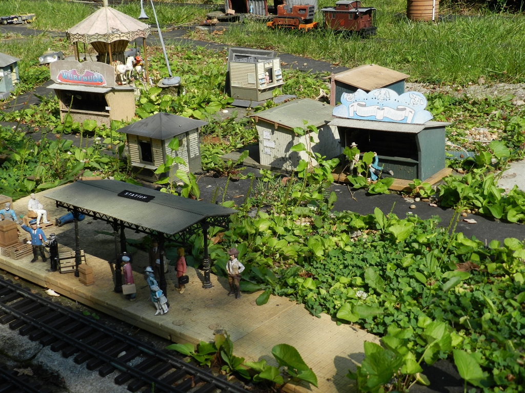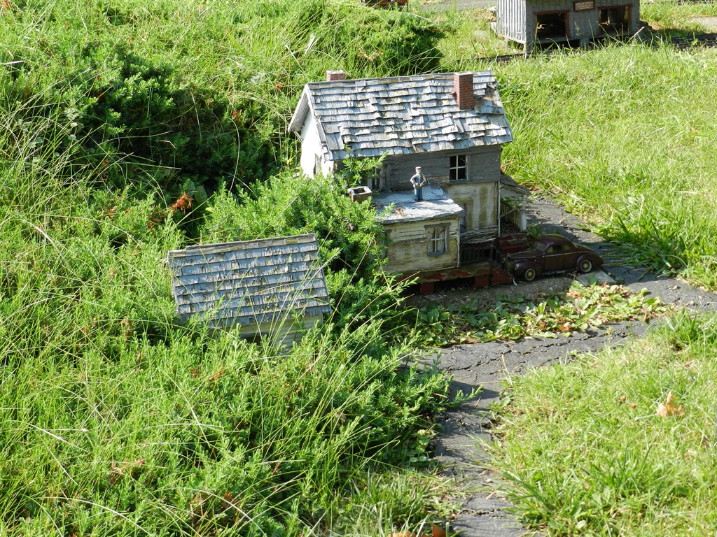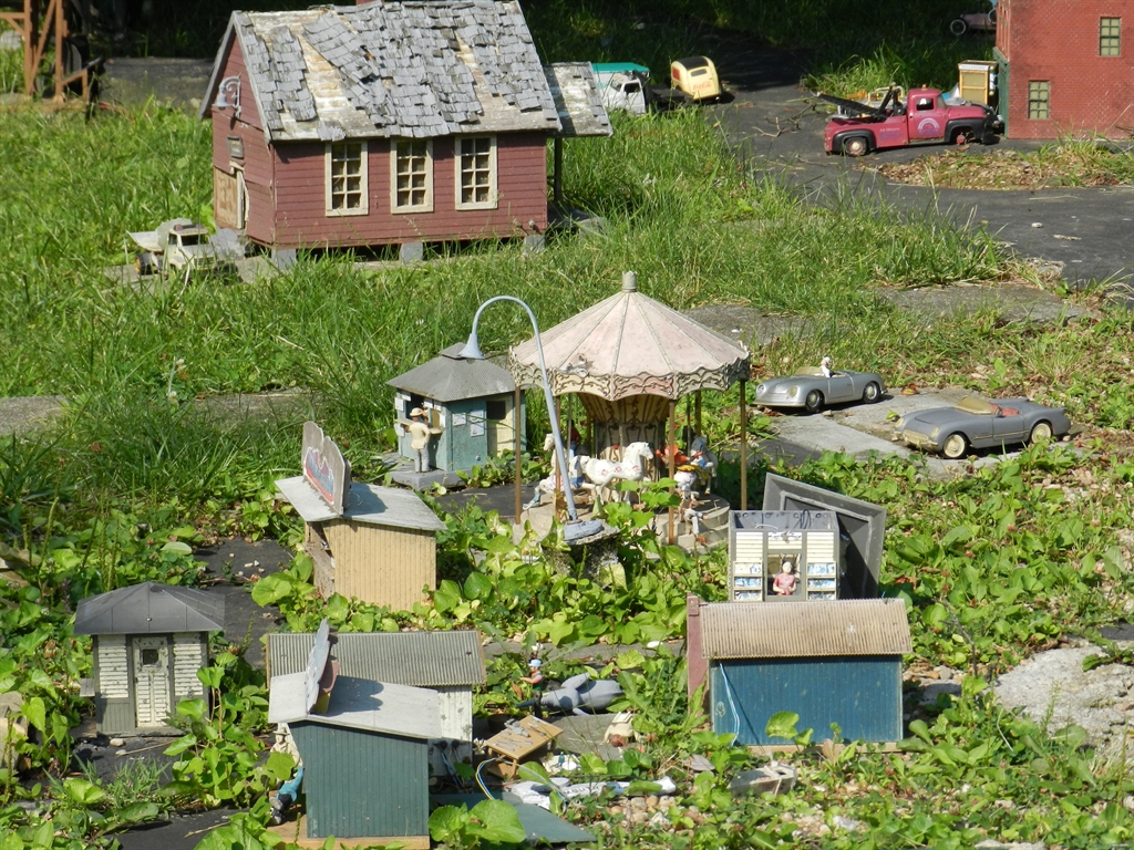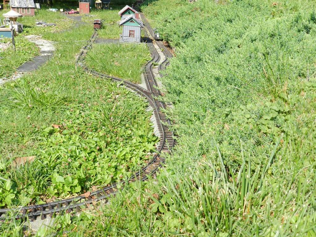 On a recent pass through Louisville, KY, quite unintentionally, we discovered the Plymouth Railroad. The PRR is a "G" scale model railroad layout that has been built into the front, side and back yard at the home of an old railroad buff. The layout contains many elements such as life-like scenes, tunnels, etc. Unfortunately, the PRR is no longer being maintained as according to the owner's wife, the owner of the PRR is now suffering from physical issues keeping him from the yard.